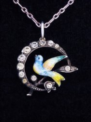 Absolutely charming little silver pendant from the late Victorian era in the form of a colourful small bird flying across a spray of leaves within a crescent shaped outline set with graduated clear paste stones.…