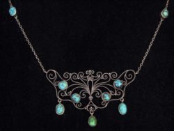 Silver wirework pendant necklace in a balanced ornate design full of twists and curves, showing a fine mill-grain finish on the leading edges. Turquoise matrix cabochons are spaced at intervals and three drops, also set…