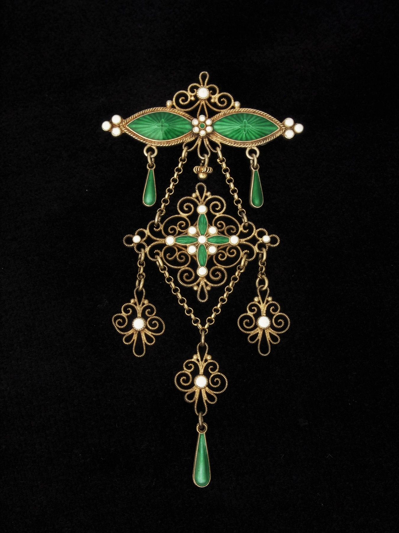 Ornate silver gilt and enamel festoon brooch from Marius Hammer dating from circa 1900-1905. A complex yet elegant wirework design with vivid green enamelling to the main topmost area, the central cross and the three…