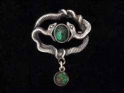 Stylish little Art Deco silver brooch in the form of a pair of snakes, their tails coiled around each other, both with their mouths agape as they attempt to eat an egg-shaped turquoise matrix stone.…