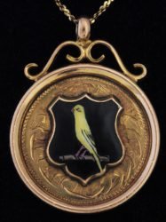 Delightful little circular pendant in 9 ct. gold with a Birmingham hallmark for the year 1925. The raised rim of the pendant encloses an etched design which frames the shield-shaped focal point of a perching…