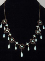 Delicately pretty silver necklace attributed to the Birmingham School of Arts & Crafts, circa 1890-1900. The oval openwork pendant set with a good turquoise matrix cabochon, with two further stones suspended below, the first on…