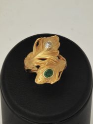 Superb Art Nouveau ring in 18 ct. gold, crafted as two peacock’s tail feathers, one set with a diamond forming the eye of the feather, the other with an emerald. Lovely detail to the barbs…