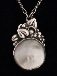 Compact Arts & Crafts silver pendant featuring a nicely contoured circular mother-of-pearl disc set beneath an arrangement of leaves and berries with a small pearl set in their centre. Fully enclosed on the back but…