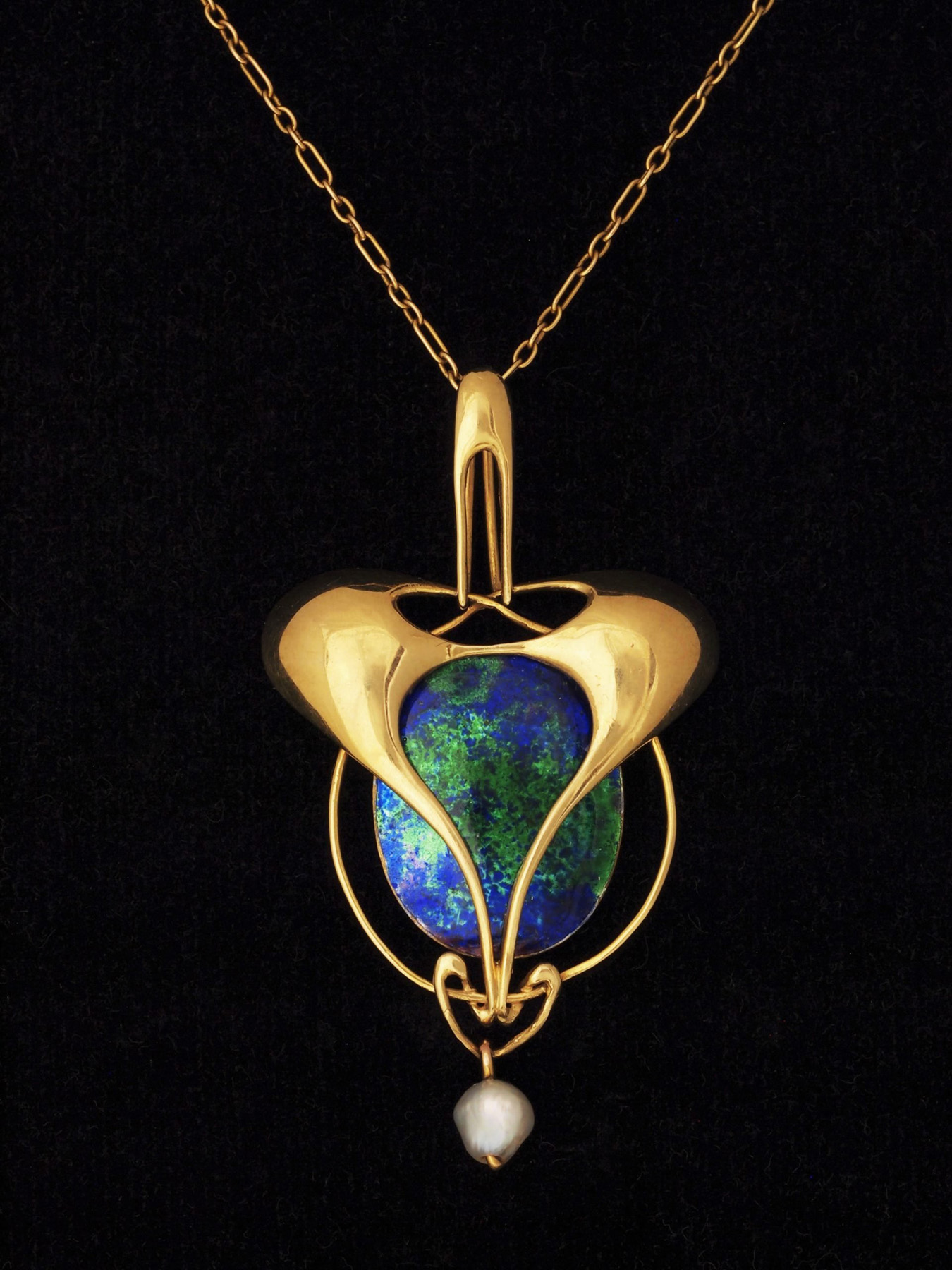 With a typically sinuous Art Nouveau design, the heart shaped gold feature partially covering the enamelled area, narrowing dramatically as it sweeps downwards to a point a the base. Here it meets another, smaller openwork heat from which the pearl drop is suspended.