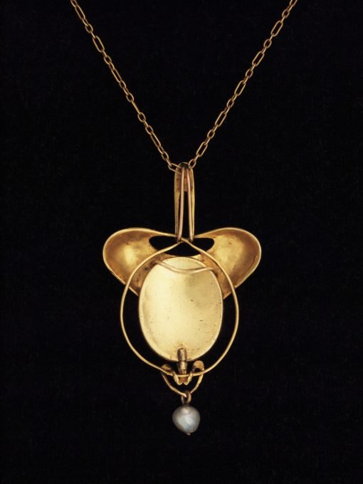 Gold pendant with an openwork entrelac design from the drawing board of Archibald Knox and dating from circa 1905. Set with a central blister pearl drop and with a turquoise matrix lower drop, this pendant…
