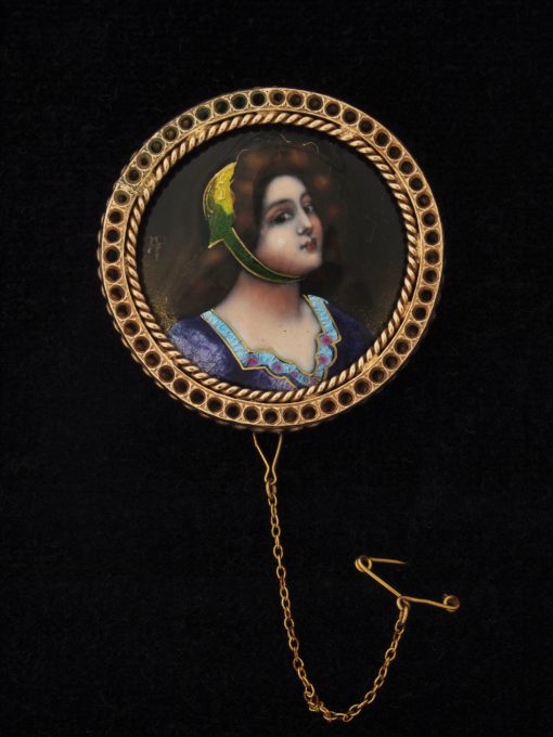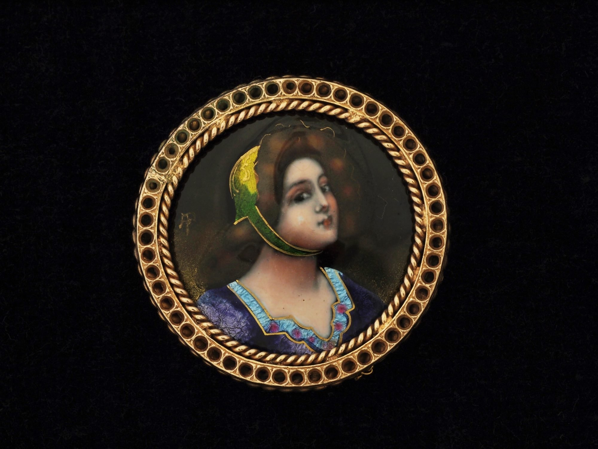 Circular brooch in high carat gold featuring a Limoges enamelled head and shoulders portrait of a lady.