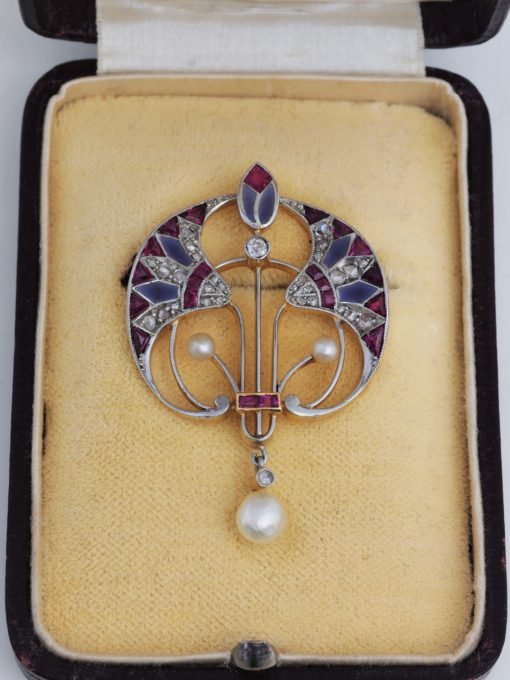 Set with diamonds, rubies and pearls, and further detailed with subtle enamelling in a shade of smoky blue.