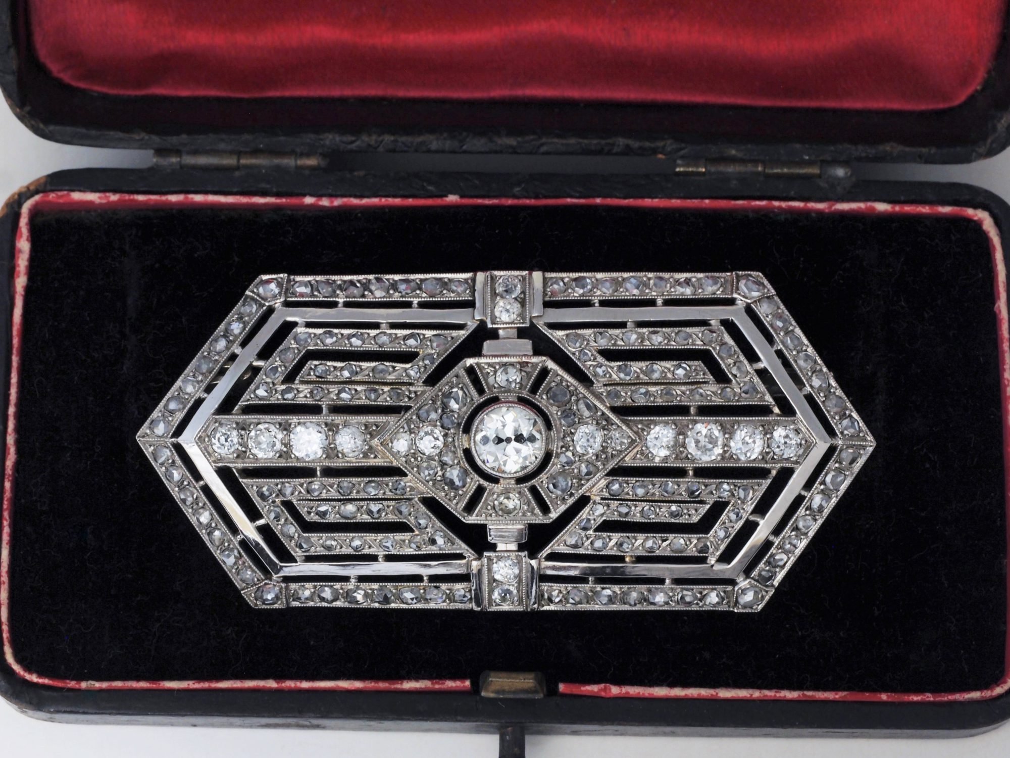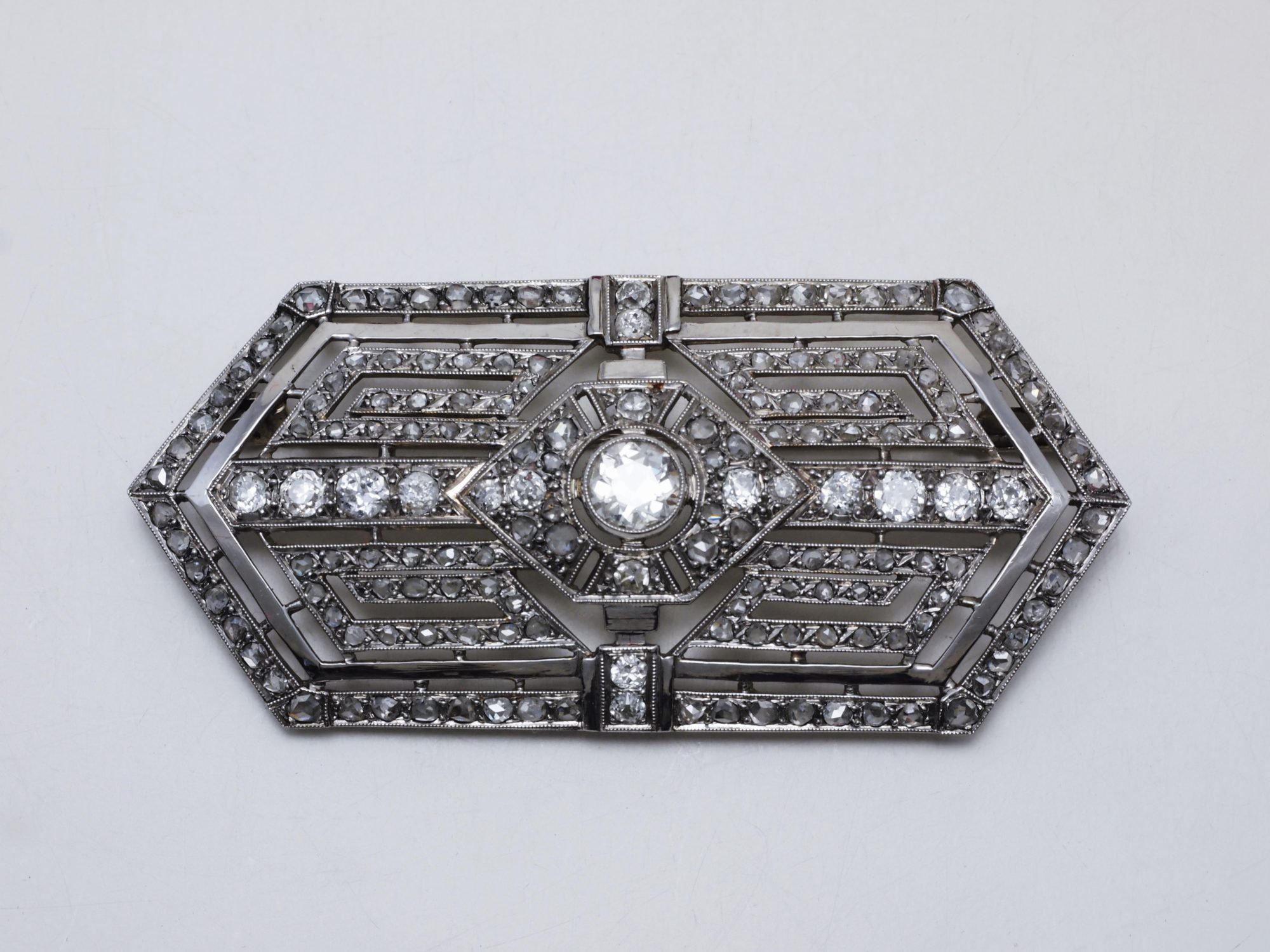 French Art Deco brooch in 18 ct. white gold, set with a multitude of diamonds.