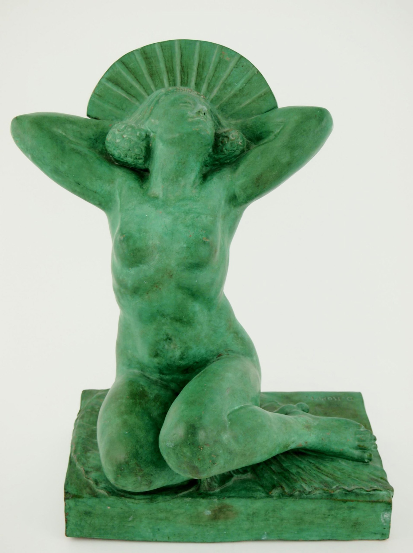 Art Deco terracotta study of a nude woman seated on the ground with her eyes closed and holding a fan behind her head. She’s a striking looking lady and obviously enjoying the warmth of the sun on her ample body.