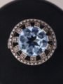 A striking circular design featuring a good size and beautifully faceted stone that tests as aquamarine, raised on little decorative pillars and detailed with sparkly marcasites all around and on the shoulders.