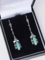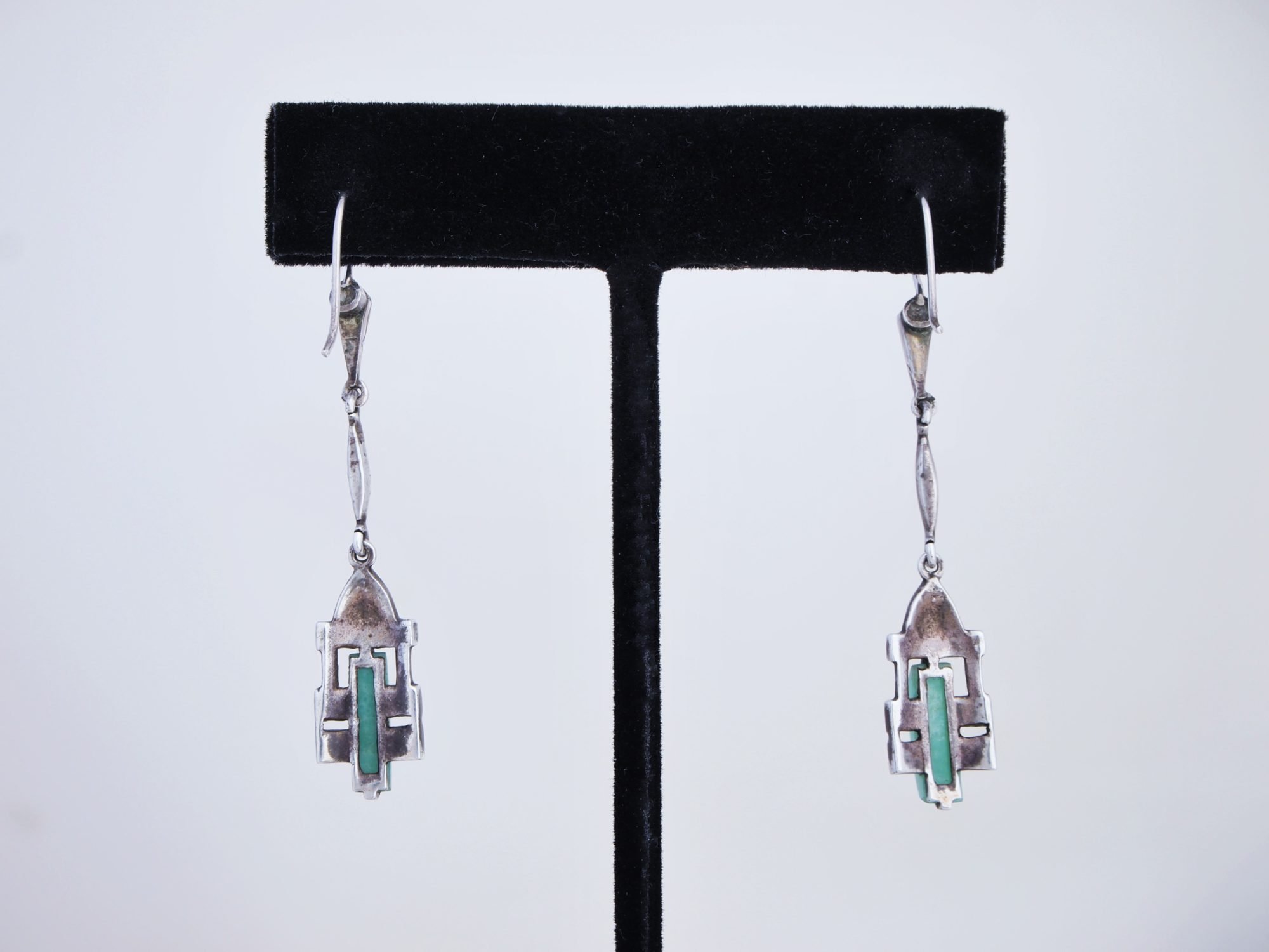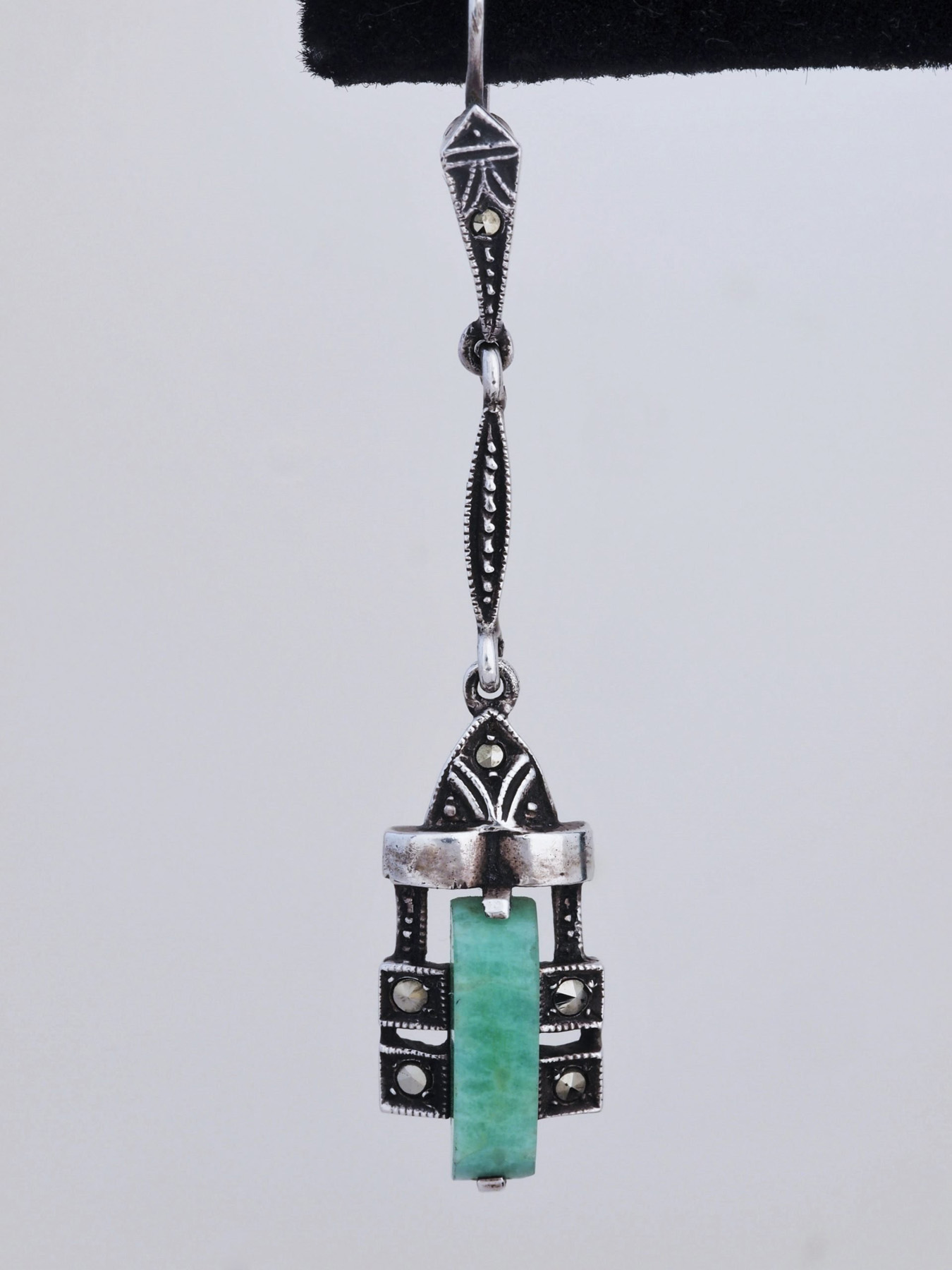 Pair of silver drop earrings in three linked sections, the larger lower one featuring an upright contoured amazonite stone which crosses over a pair of horizontal silver components detailed with marcasites.