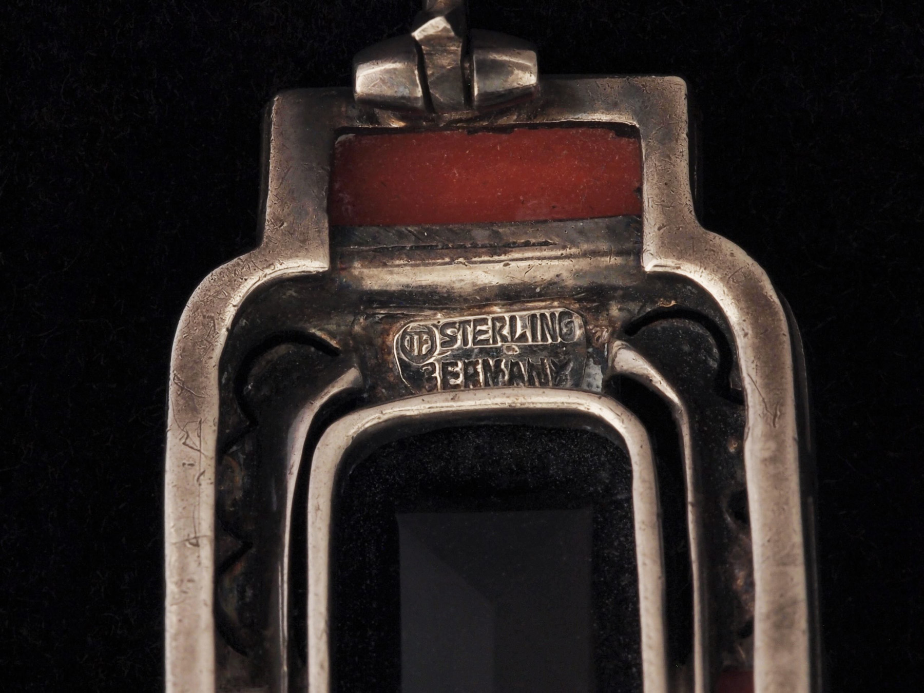 Sparkle is added by the addition of marcasites which ornately border the onyx, set in a combination of geometric and rounded silverwork.