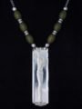 This is securely set in a silver mount which is suspended from a decorative chain, the lower part of which features green beads and decorative metal spacers.