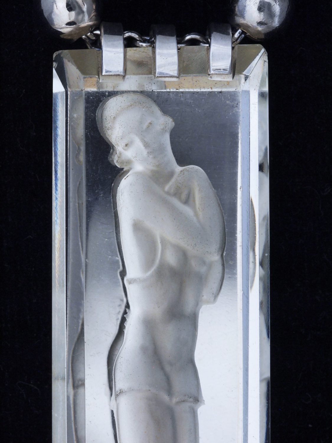 Striking Continental Art Deco necklace featuring a long, upright glass panel with the molded image of a young woman dressed in a one-piece swimsuit with her arms folded across her chest.