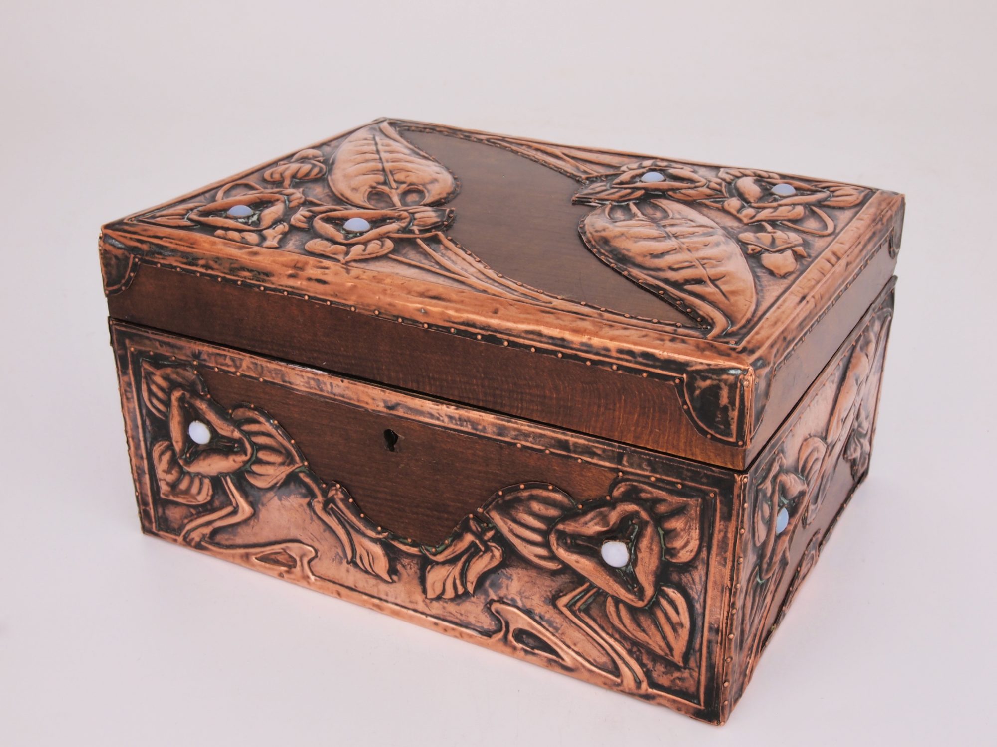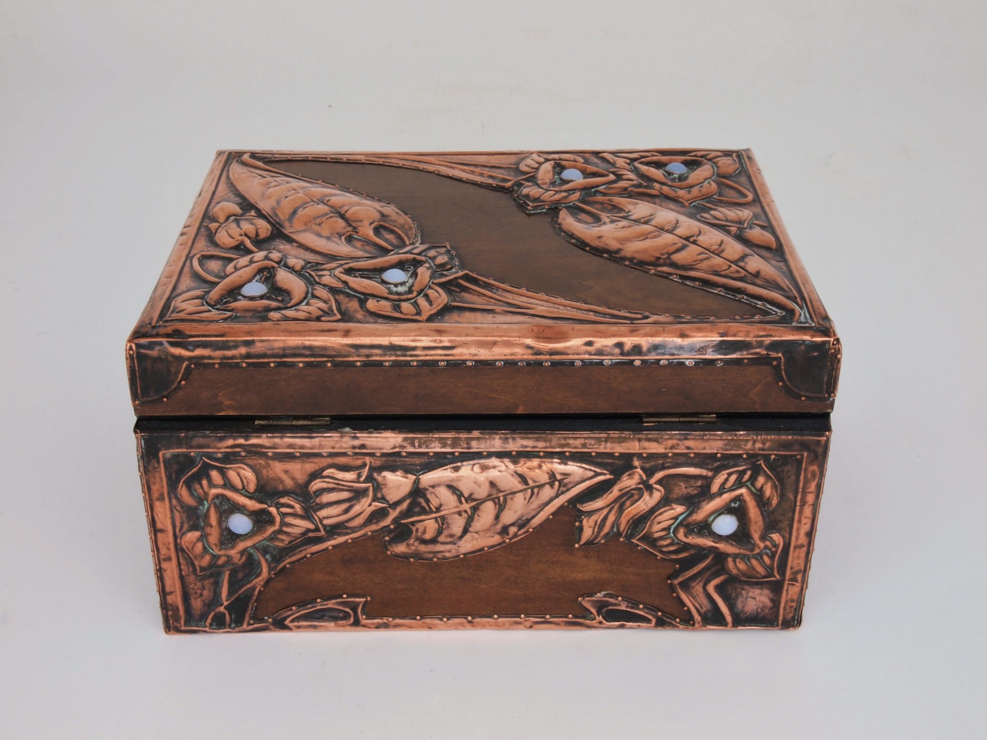 Art Nouveau / Arts & Crafts wooden box with applied repoussé decoration in a floral and foliate design, further embellished with opalescent glass cabochons.