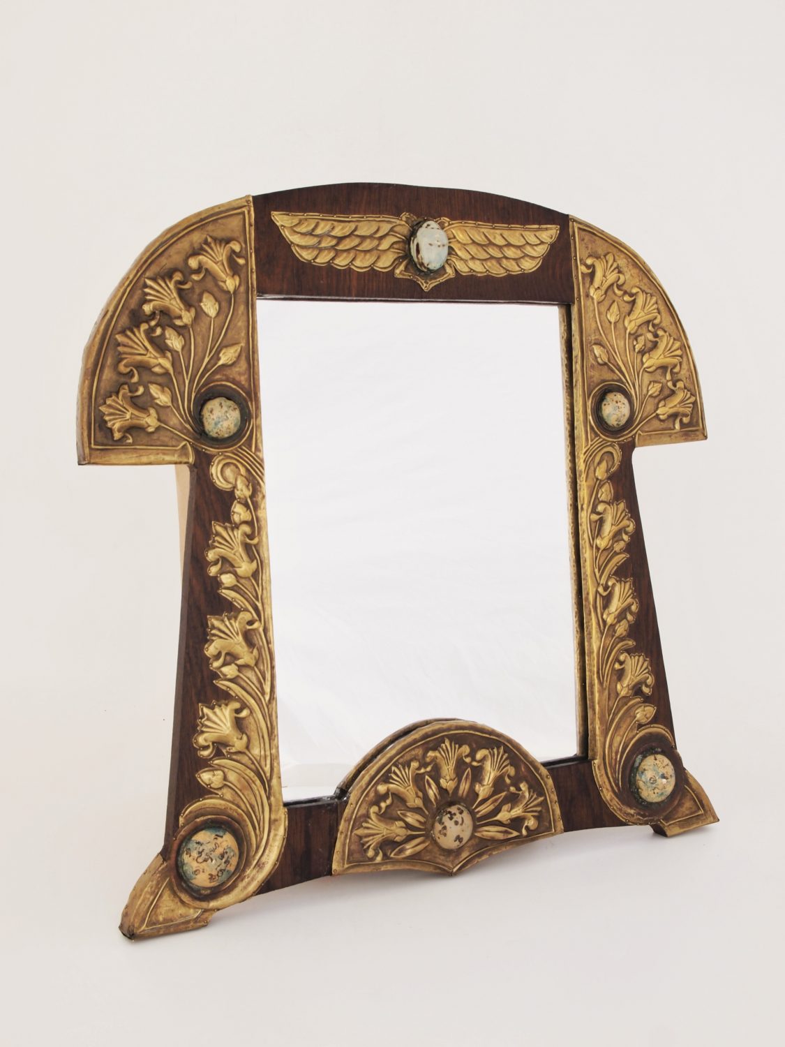 On each side of the mirror plate, the frame is detailed with stylised flowers and buds, and a pair of creamy coloured stone cabochons with touches of blue. The semi-circular panel beneath the mirror is decorated in the same theme and shows a similar centrally placed cabochon.