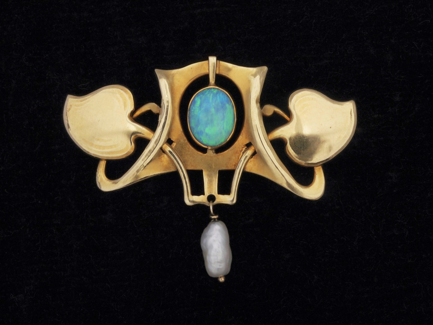 It’s a design we’ve not come across before, showing a boldly shaped outline with a pair of stylised leaves on curving stems each side of a flared central area which frames a very nicely coloured oval opal.