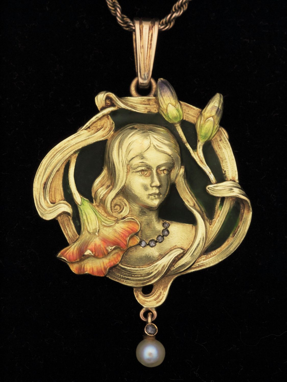 Delightful high carat Art Nouveau gold pendant with the portrait of a young maiden.