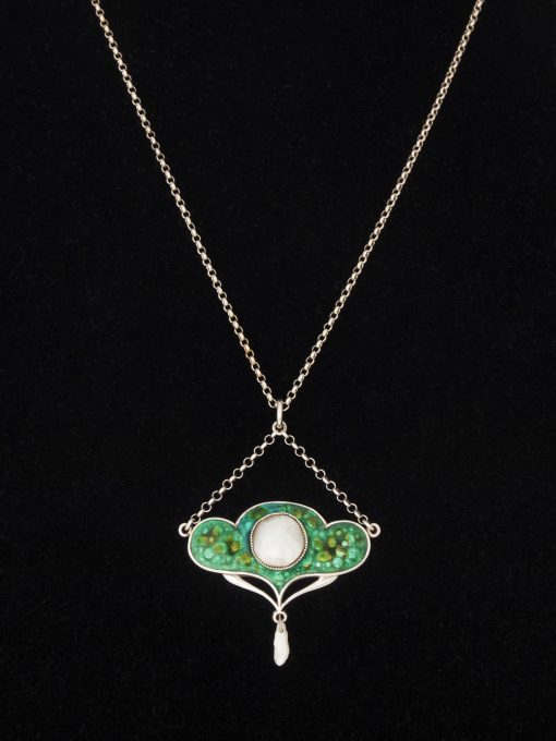 Prettily shaped Art Nouveau silver and enamel pendant set with a central mother-of-pearl disc and completed with a little wing pearl drop.