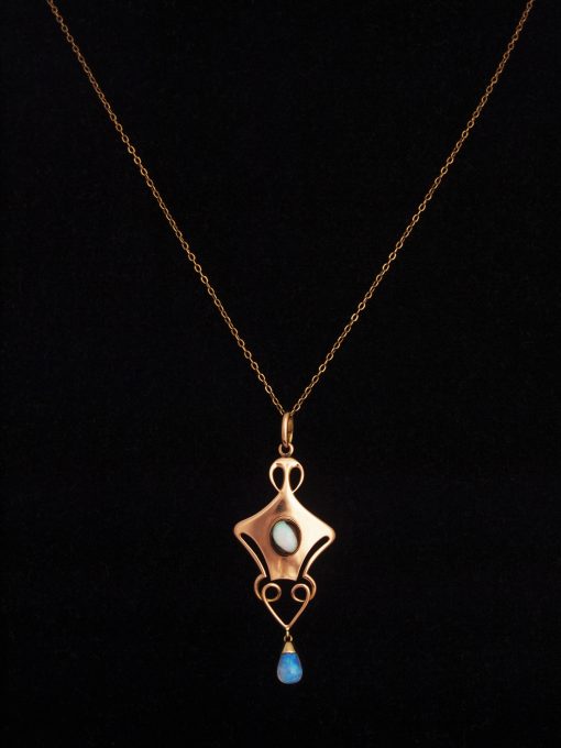English Art Nouveau pendant in 9 ct. rose gold set with an unusually fine boulder opal, with an equally fine opal bead drop.