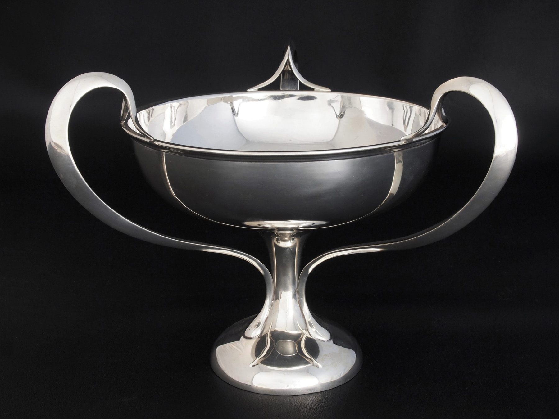 With delighfully elegant lines, the three handles sweeping outwards and up from a circular tapering base, rising above the bowl before curving downwards and dividing into two at the point where they join the rim.