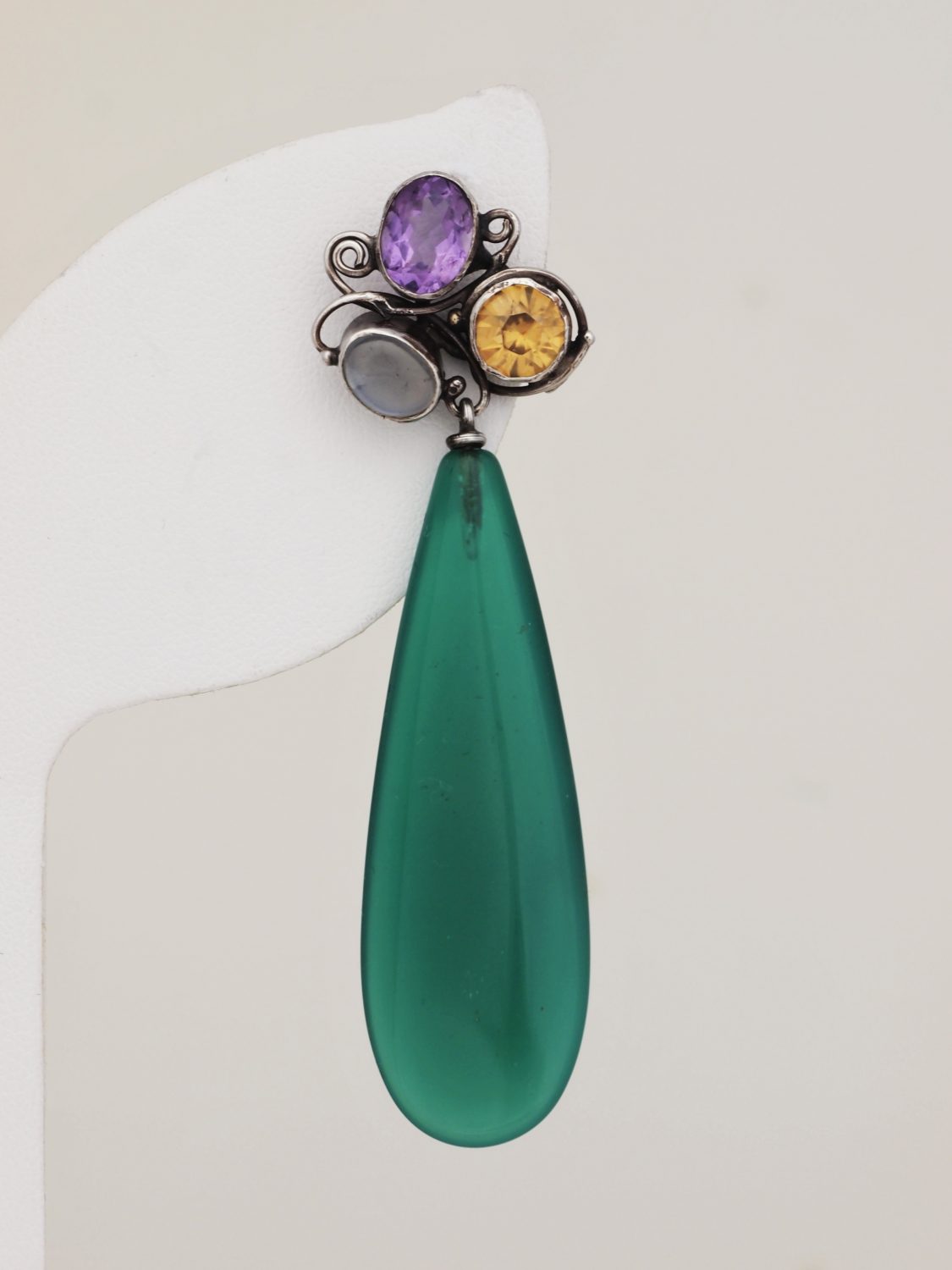 With long, tapering and rounded green drops suspended beneath a cluster of three contrasting gemstones, comprising an amethyst, a citrine and a moonstone cabochon.