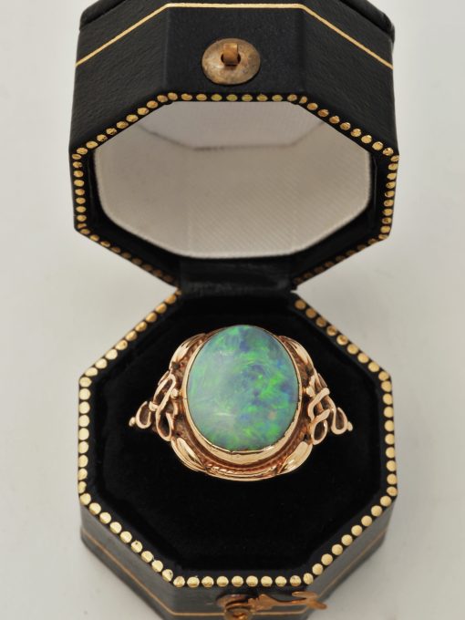 Arts & Crafts gold ring with a beautifully coloured opal stone set in its centre and a semi-openwork scrolling design on the flared shoulders together with a detail of little leaves.