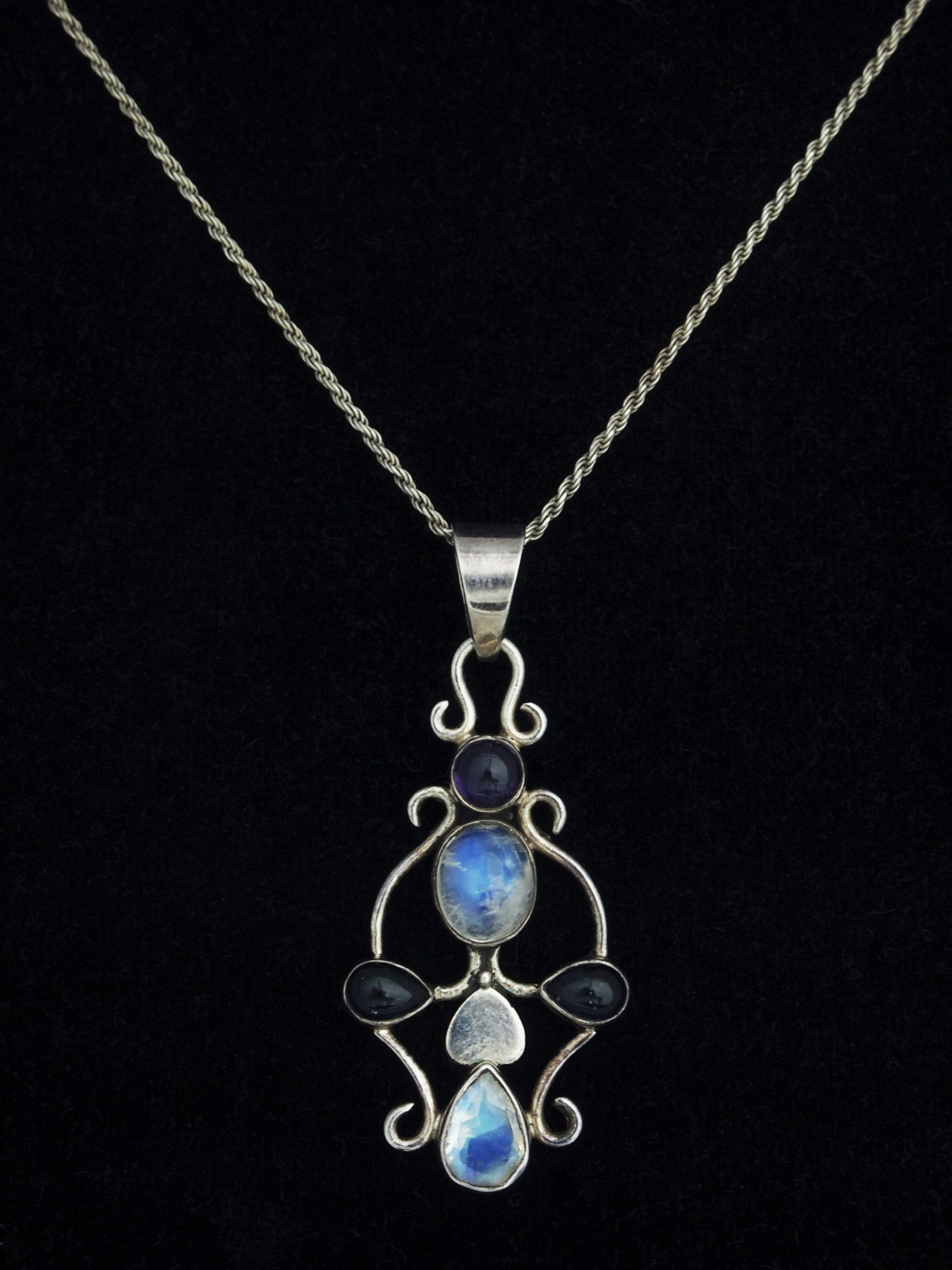 Silver Arts & Crafts pendant with an openwork design set with an oval moonstone cabochon above another that is faceted and teardrop shaped.