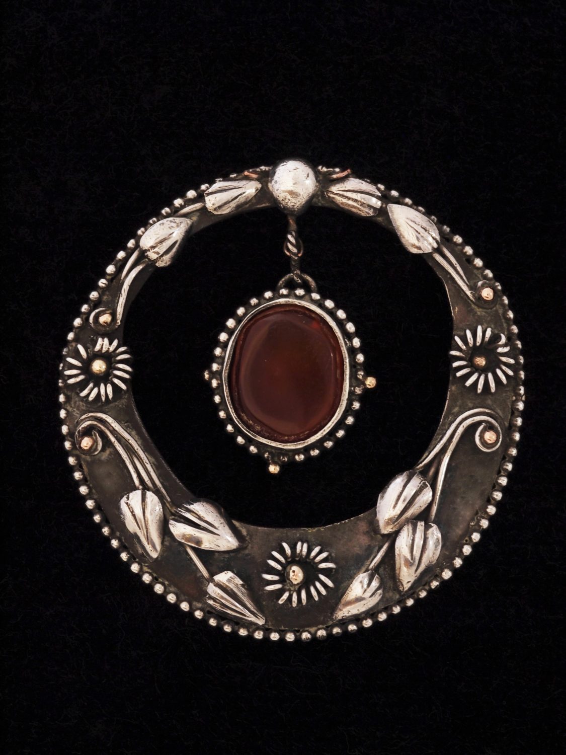 Circular Arts & Crafts silver brooch with a deep orange coloured carnelian, surrounded by a beaded border, suspended in the centre.