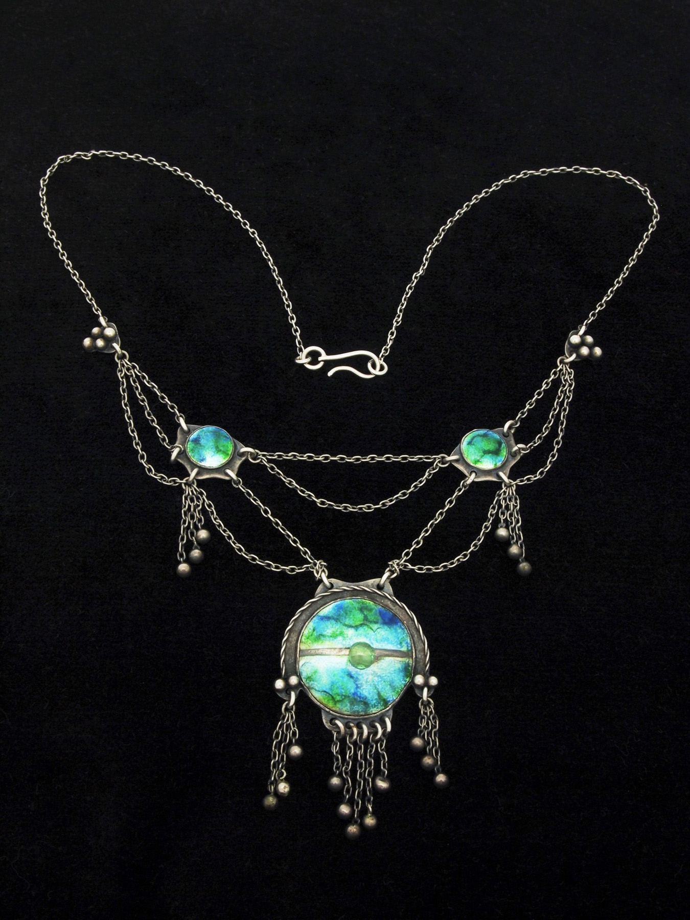 Silver and enamel Arts & Crafts necklace with ornate chainwork and a complex of little graduated length drops.