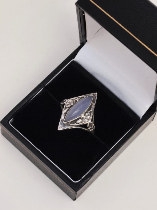 Arts & Crafts silver ring featuring a diamond-shaped top section fashioned with stems and leaves against a hammered background.