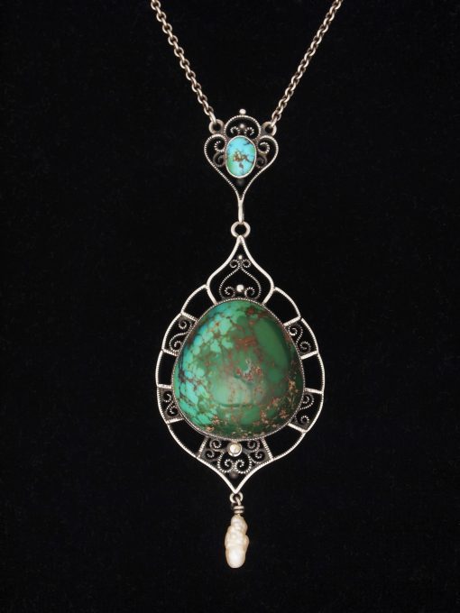 This hangs from a similarly styled suspender which also houses a smaller turquoise matrix stone.