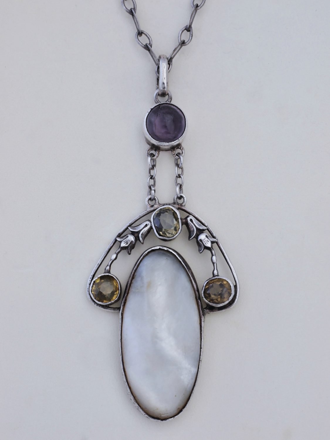 Arts & Crafts silver pendant with a very individual look, featuring a prominent and well contoured mother-of-pearl focal point, flanked a little way down from the top by a frame of silver wire-work. This is decorated with a pair of bell flowers on each side, together with three yellow stones that we’ve been unable to identify with any certainty.