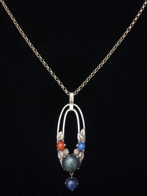 Stylish Arts & Crafts oval silver pendant of an open design with little silver leaves and rose flowers concentrated in the lower half.