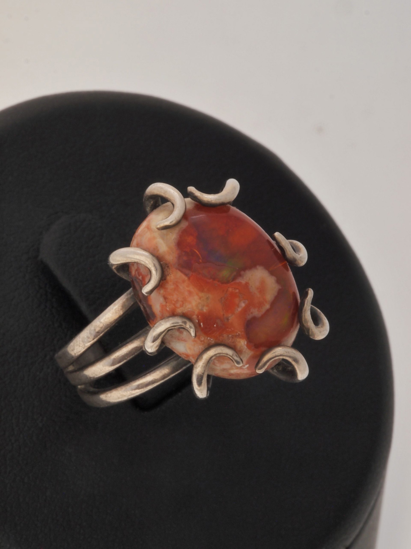 Unusual Arts & Crafts silver ring highlighting an oval boulder opal set inside prominent shaped claws.