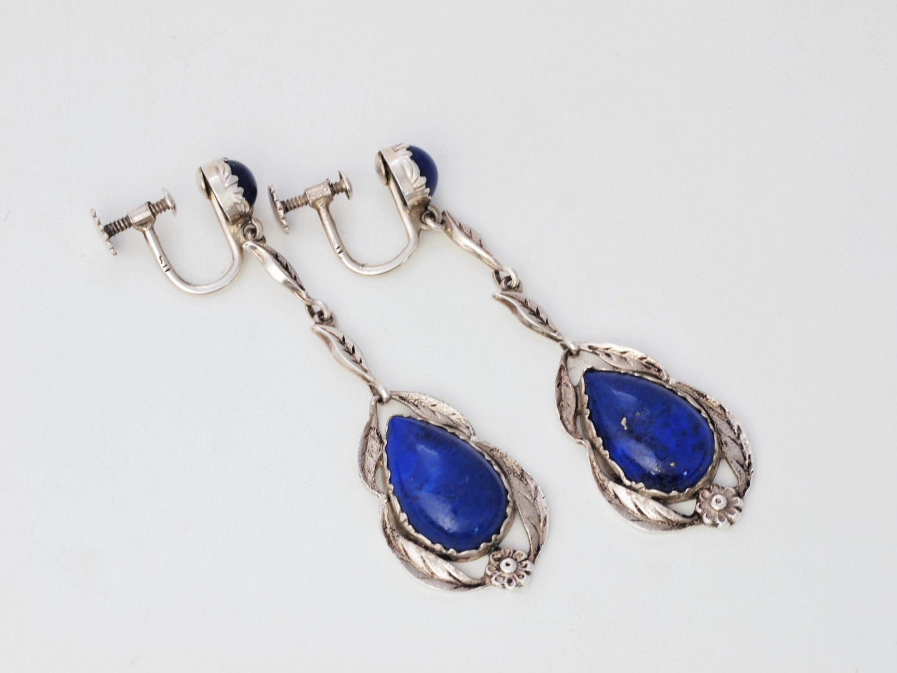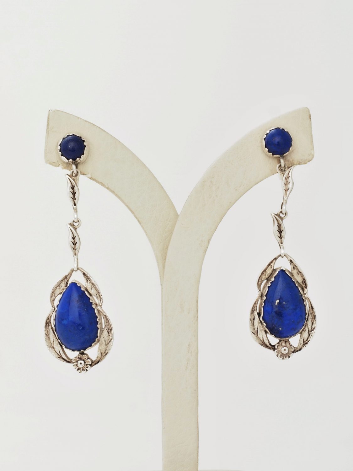 Suspended from screw-type fittings on a pair of linked elongated leaves, the main pendant is in the form of four further leaves and a single flower surrounding a teardrop shaped Swiss lapis cabochon set in the centre.