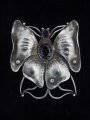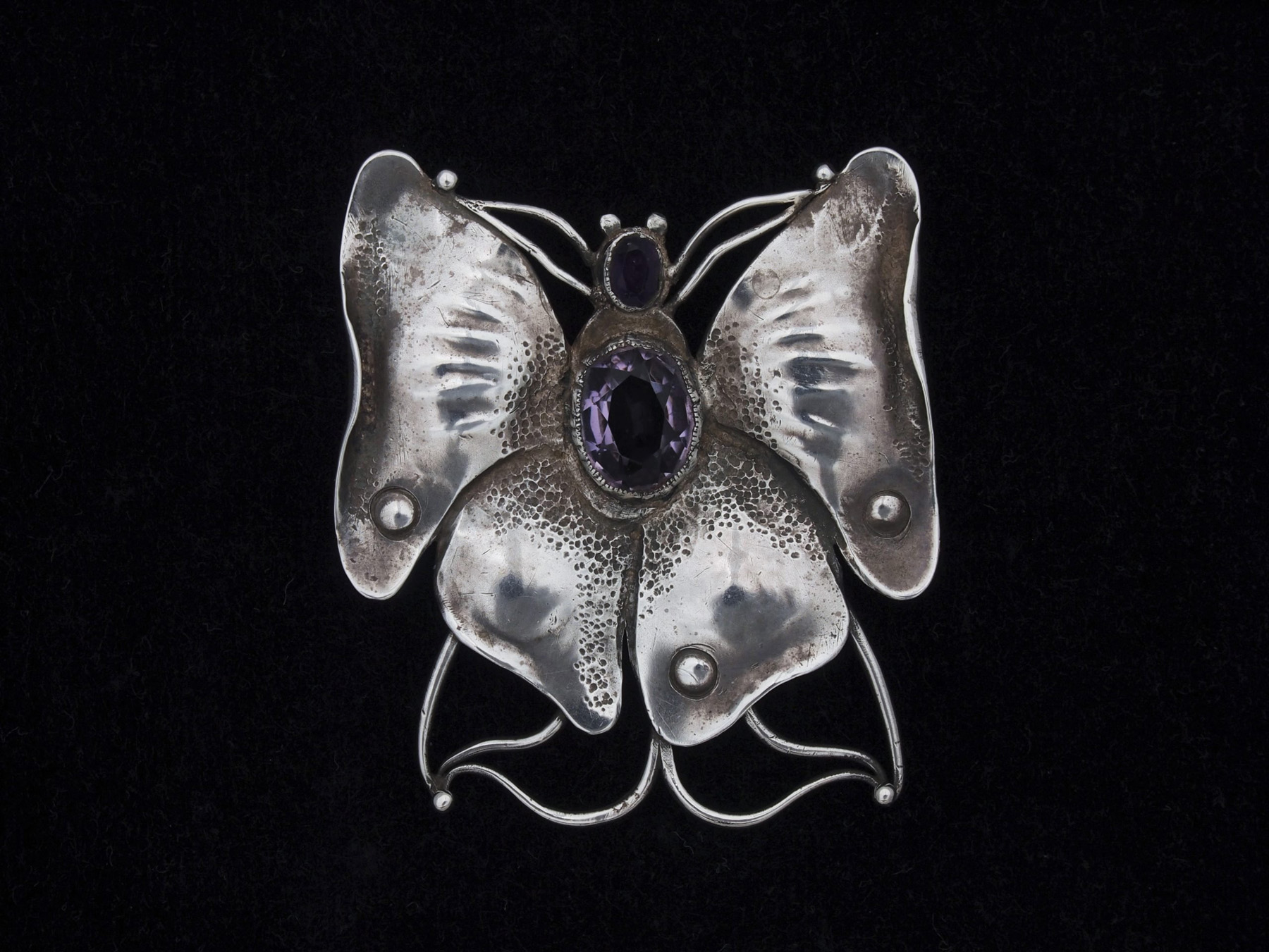 English Arts & Crafts silver brooch in the form of a stylised butterfly, set with faceted amethyst stones.