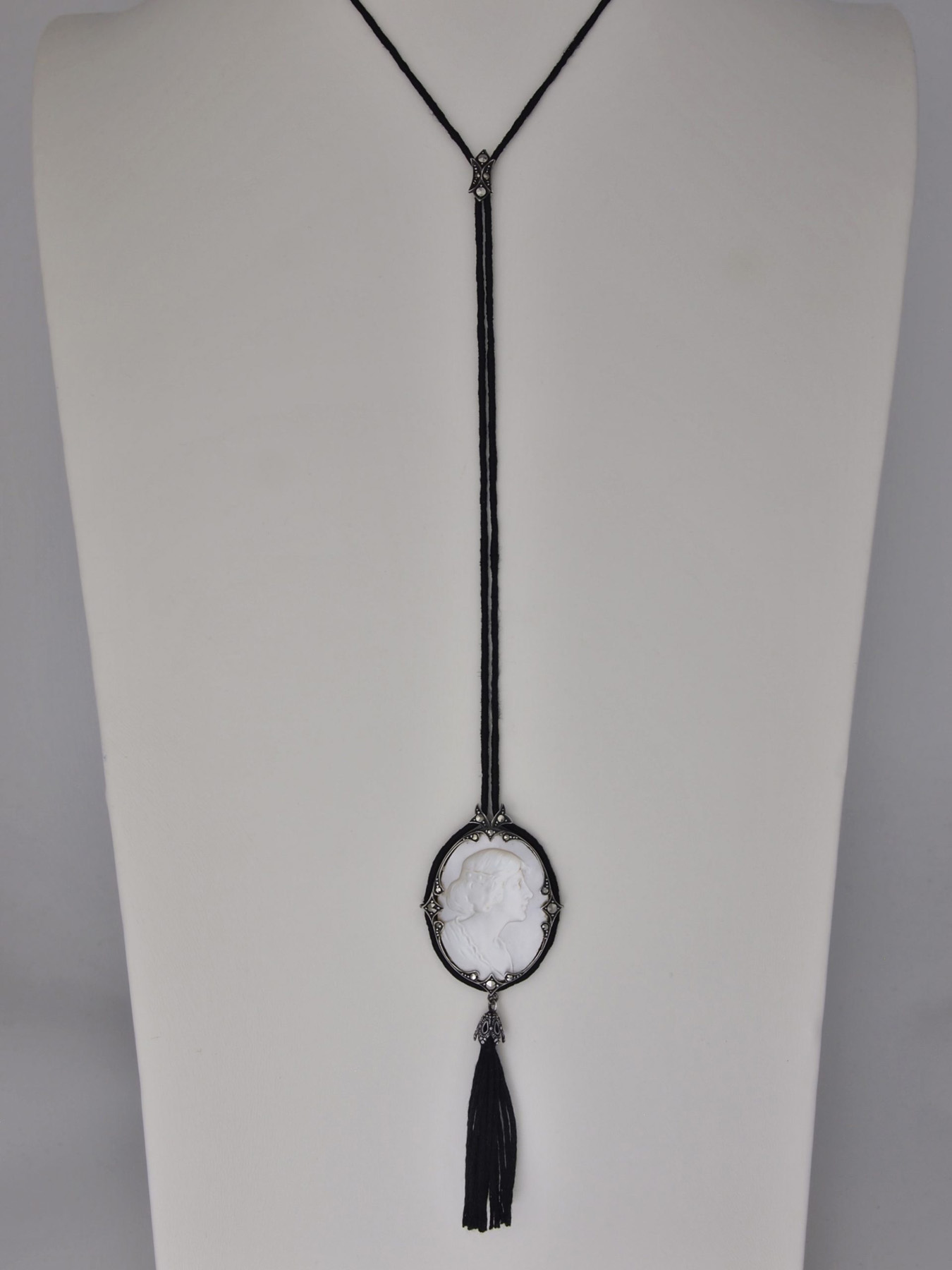 The oval plaque is bordered by a narrow silver frame decorated with a marcasite design detail, and with a bell flower shaped silver drop suspended below to which is attached a black tassel.