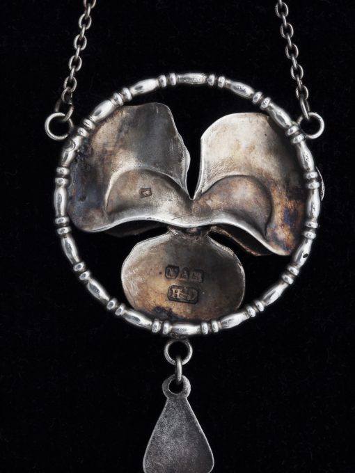Silver pendant from Charles Horner in the form of a pansy flower, the overlaying petals colourfully enamelled in shades of violet and golden yellow.