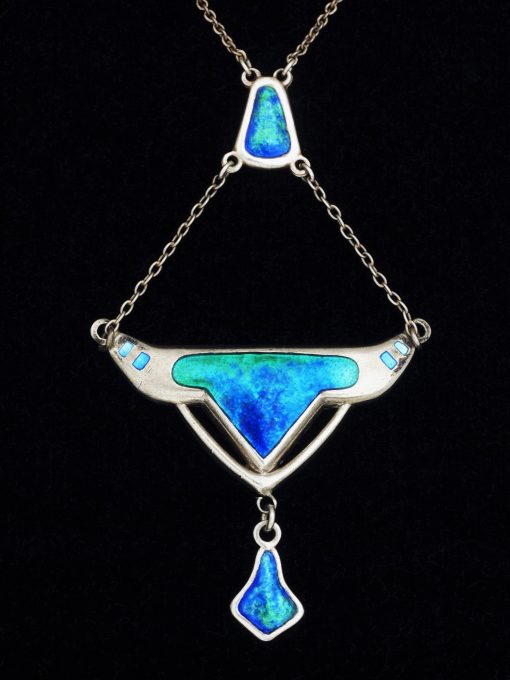Wing-shaped silver pendant enamelled in shades of blue and green with little light blue highlights at the wing tips.