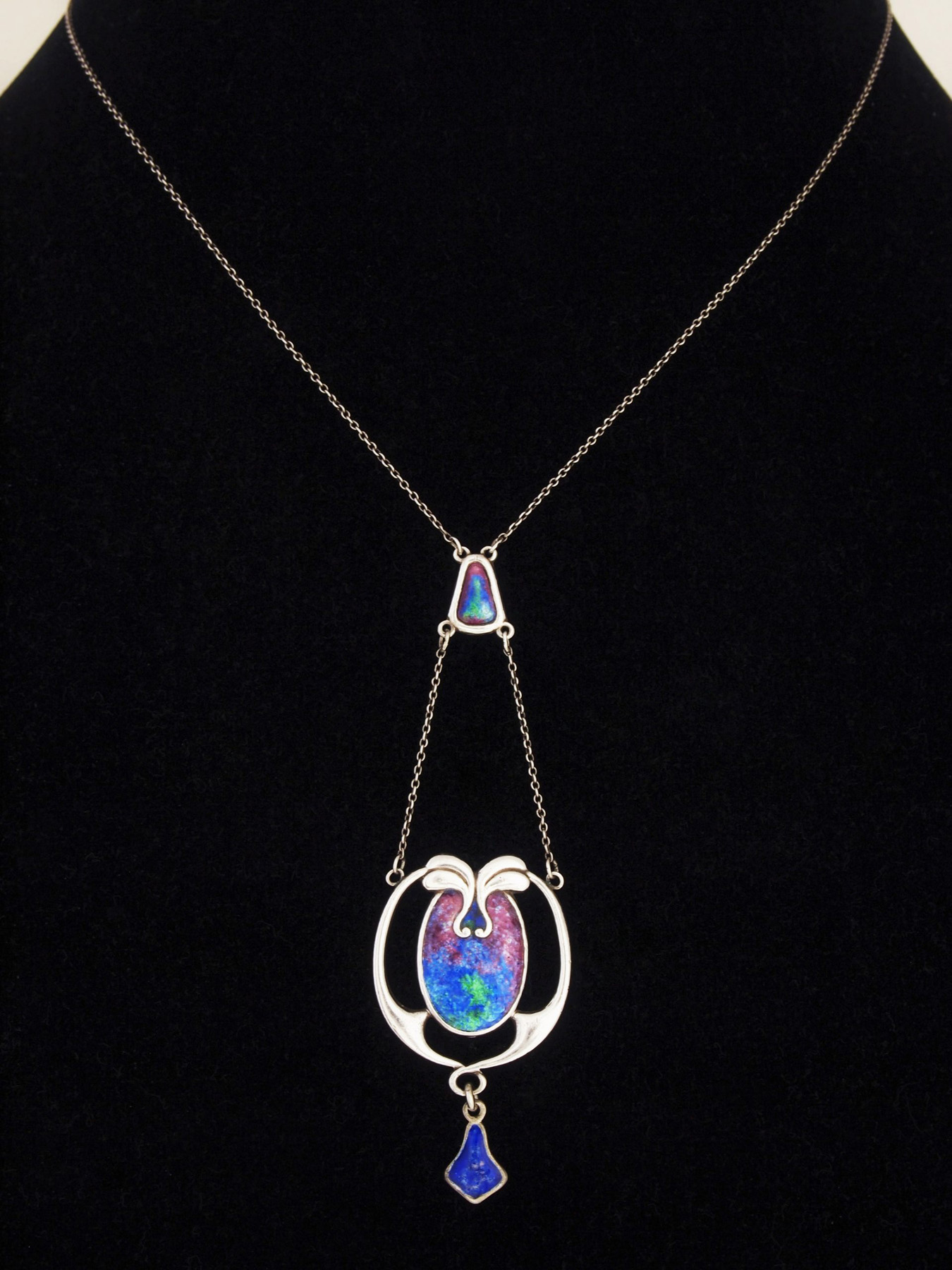 A silver and enamel pendant necklace from Charles Horner in a design we’ve not come across before.