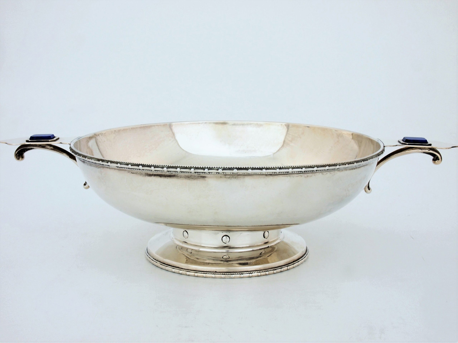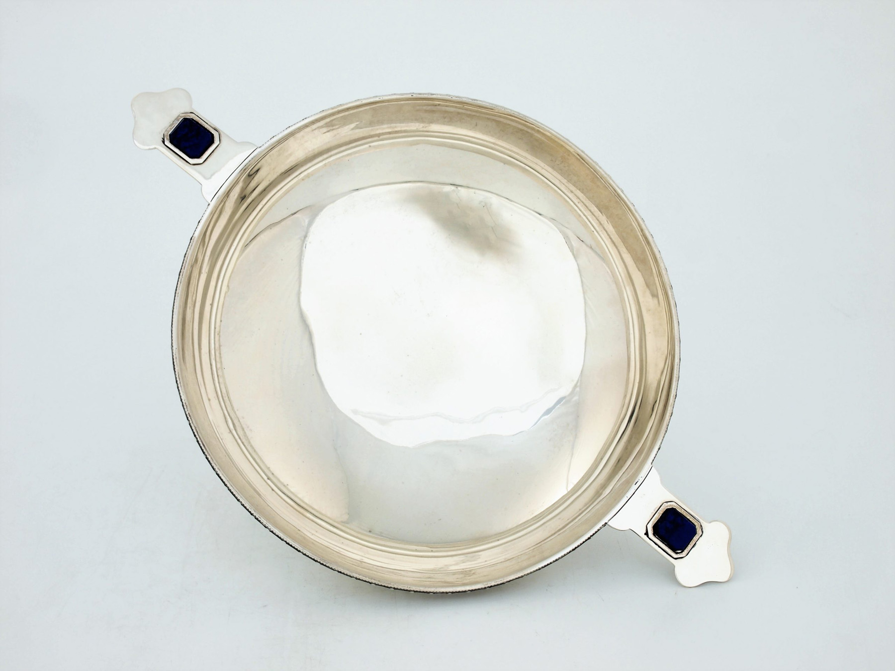 Rectangular lapis lazuli stones with faceted edges are set into both handles which abut the edge of the rim, supported from below by curved brackets.