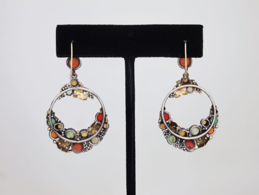 Pair of English Arts & Crafts earrings in a combination of silver and gold set with assorted gemstone cabochons in autumn hues.