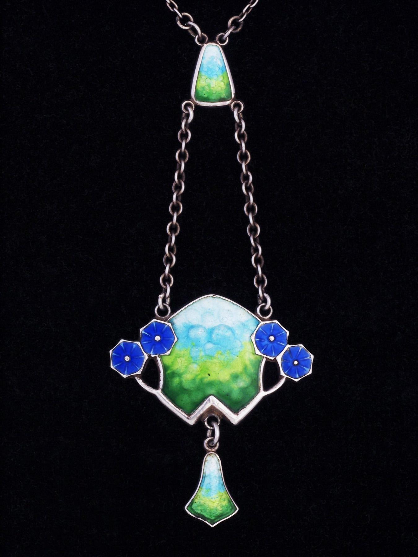 An Art Nouveau silver and enamel pendant necklace in a design more often seen made by Charles Horner, with the central section enamelled in shades of light blue and green showing an attractive bobbled surface.