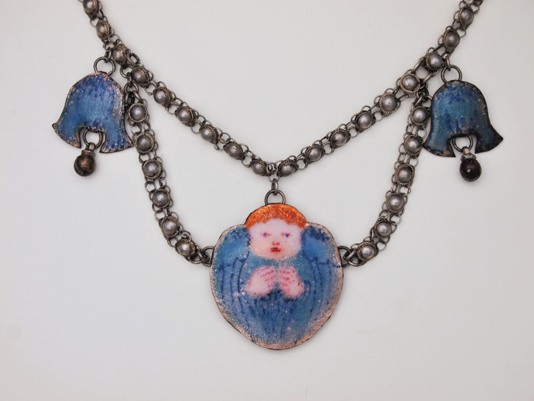 Charmingly naive Arts & Crafts silver necklace featuring a central enamelled plaque with a little winged cherub, his hands and face peeking out through his folded wings.
