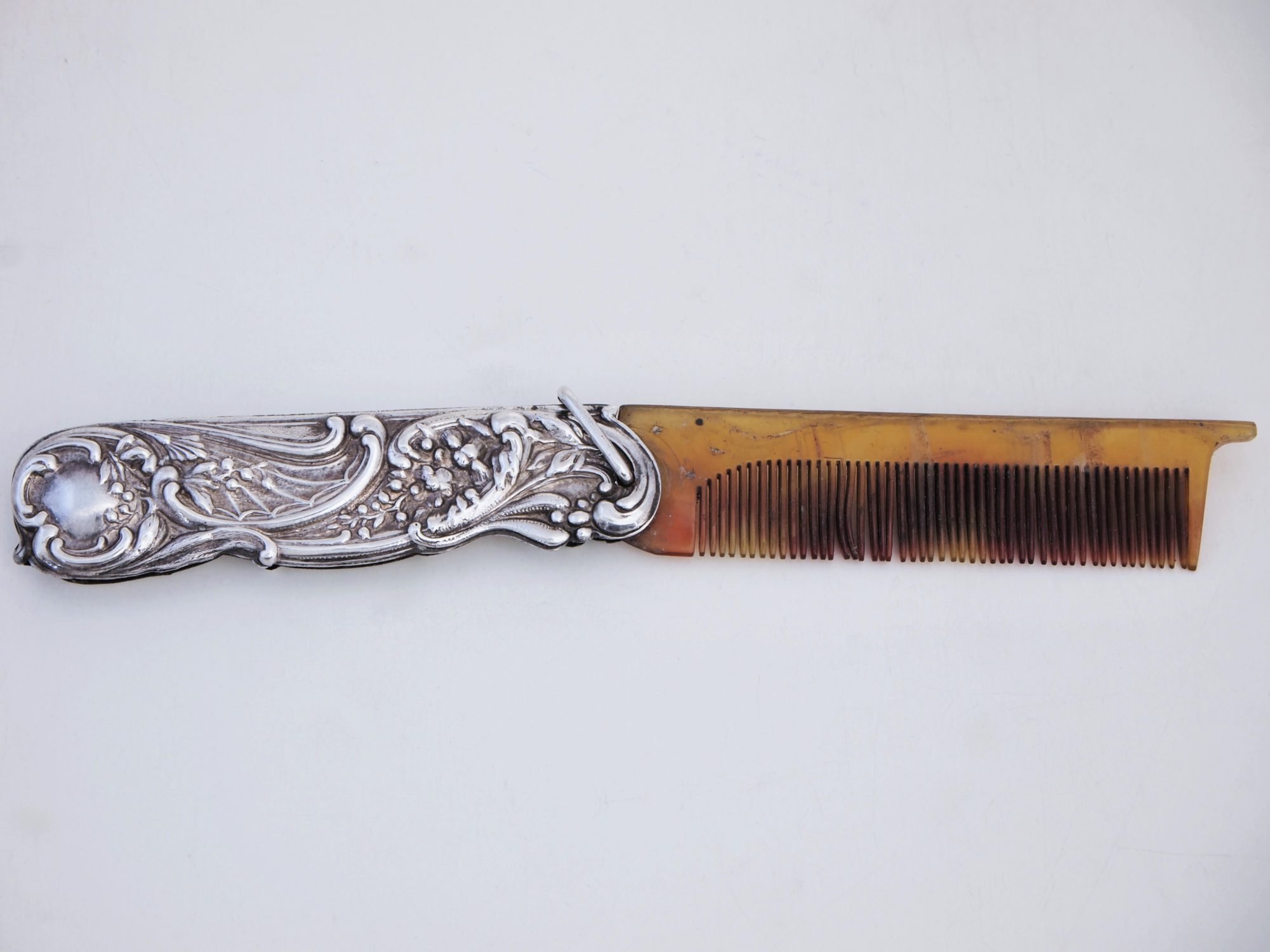 The fine-toothed horn comb folds out from within its beautifully decorated silver case to be immediately ready for use.