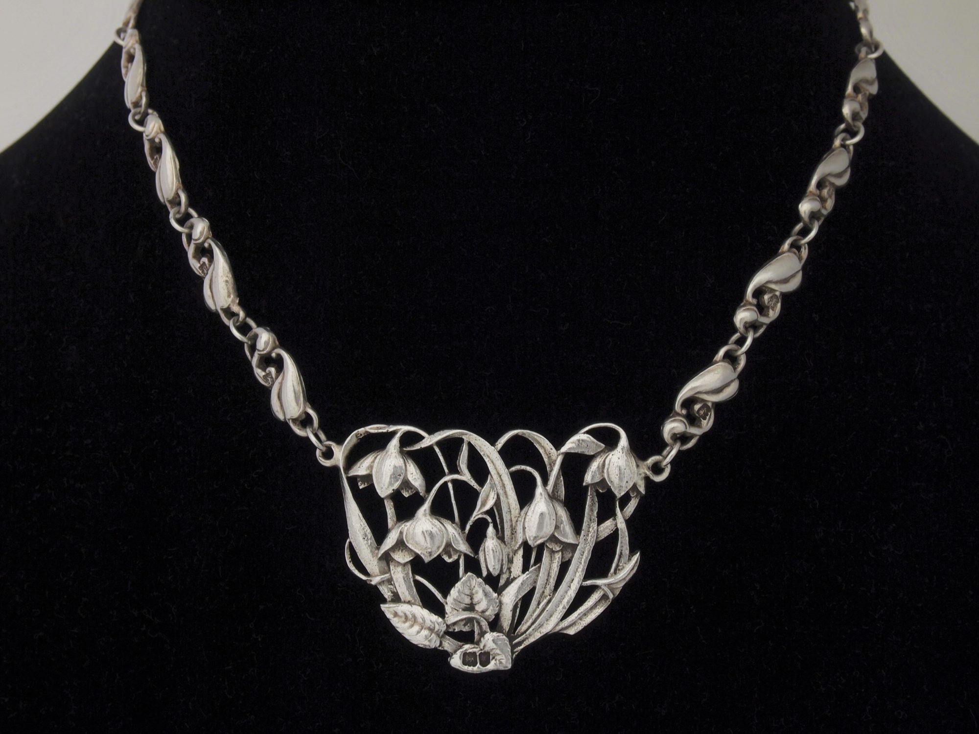 The lower part of the necklace chain incorporates a series of linked stylised leaves, each one bearing the impressed lion passant hallmark.