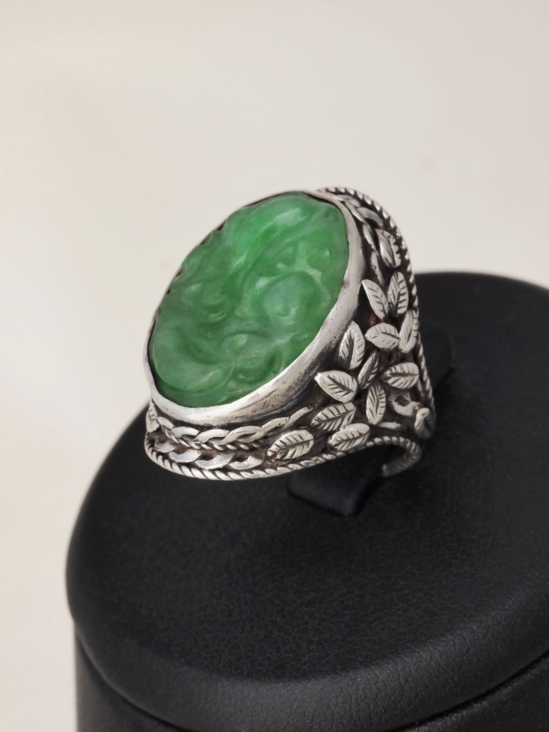 Set in the centre is a fine carved jade stone which contrasts beautifully with the silver.