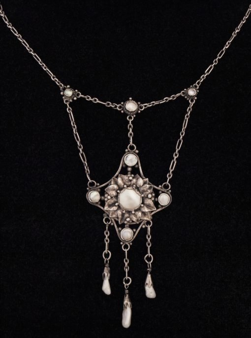 English Arts & Crafts silver necklace with a distinctly individual look, set with mother-of-pearl and with three long baroque pearl drops.